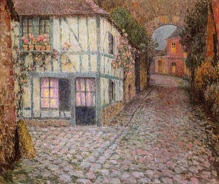 Эжен Анри Ле Сиданер родился во французской семье в Порт-Луи на Маврикии, в?870 он переехал на север Франции. Мечтая стать художником, Ле Сиданер отправился в Париж, где поступил в Школу изящных искусств в мастерскую к одному из самых известных академистов своего времени — Александру Кабанелю. Этот творец прославился салонными портретами, псевдоисторическими картинами и консервативными взглядами, поэтому неудивительно, что Эжен начал конфликтовать с наставником и был вынужден покинуть Школу. В 1885 Сиданер оставил Париж и переехал на север Франции в городок Этапль, где обосновалась коммуна художников. Дешевизна жизни в провинции, протяженные дюны и живописные виды на пролив Ла-Манш привлекали сюда начинающих и непризнанных творцов из Англии, Австралии и других англоговорящих стран. Мастер с небольшими перерывами прожил здесь вплоть до 1894, затем отправился путешествовать по Европе. Успех пришел к нему в конце XIX — начале XX века, когда он начал выставляться на Салоне, у Жоржа Пти, одного из ведущих галеристов Парижа, специализировавшегося на импрессионистах, и в галерее Гоупил в Лондоне, где также устраивались выставки импрессионистов и постимпрессионистов. На картине изображен уголок старого города с улицами, мощенными булыжником. На переднем плане стоит типичный средневековый двухэтажный дом с цветочными горшками на окнах, на заднем возвышается городская стена с арочным проходом, в котором виднеется следующий дом. Светлые сумерки и неяркие огни в окнах создают романтическую атмосферу.Искусство Японии