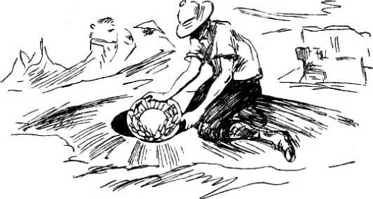 Верблюд терпеливо шагал, осторожно ставя копыта на дымящийся песок. Миллионы песчинок катились под дыханием жаркого ветра, и следы исчезали, словно кто-то их тщательно стирал. Мгла заволакивала небо; воздух, потемневший и тяжелый, почти не пропускал света. Солнце, по которому Витя пытался определить место стоянки, исчезло, и мальчику от беспрерывного покачивания верблюда начало казаться, что животное кружится на месте. Багровые пески двигались, сыпались, дымились. Они выплывали из-за жгучей мглы, падали и снова появлялись на прежнем месте — бесконечные, одинаковые, страшные своим однообразием. Минутами Вите казалось, что пески с невероятной быстротой вертятся в противоположную сторону, как бывало, когда слишком долго кружишься на карусели. Витя еще и еще раз пытался уловить солнечный луч, пытался определить направление, но невидимое солнце висело где-то за красной мглой, и верблюд продолжал итти неизвестно куда.
