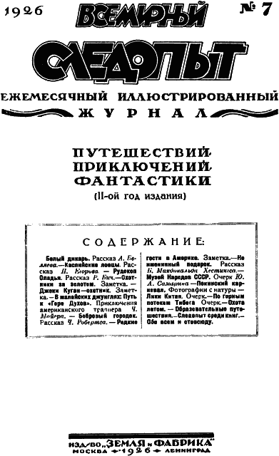 В редакцию «Всемирного Следопыта» доставлены для отзыва следующие книги изд-ва «Земля и фабрика»: Б-ка сатиры и юмора. Марк Твэн. Как я редактировал газету. Рассказы. 32 стр. 13 коп. — Растраты и растратчики. Сборник рассказов. 32 стр. 13 коп. — Свэн Волчья жизнь. Рассказы. 32 стр. 13 коп. — Милль-Полярный. Житейские соблазны. Рассказы. 32 стр. 13 коп. Рабоче-крестьянская б-ка. Павел Дорохов. Потоки. Рассказ. 32 стр. 12 коп. Т. Дмитриев. Тиханка. Рассказ. 20 стр. 12 коп. — Павел Лесняк. Мирская заступа. Рассказы. 32 стр. 12 коп. — Павел Лесняк. Соль. Рассказ. 32 стр. 12 коп. — Гусев-Оренбургский. Кошмар. Рассказы. 32 стр. 12 к. — Под'ячев С. Карьера Дрыкалина. Рассказ. 32 стр. 12 коп. Б-ка молодежи. Иван Кундрушкин. Ванька острожник. Повесть. 80 стр. 50 коп. Владимир Ветров. Кедровый дух. Повести и рассказы. 192 стр. 1 р. 30 к. Эгон Эрвин Киш. Неистовый репортер. Заметки обыкновенного человека. Перев. с немецкого Александра Оленина. 128 стр. 80 коп. — Вл. Бахметьев. Железная трава. Собр. соч., т. II. Рассказы. 176 стр. 1 р. 80 к. — Неверов А. Полное собрание сочинений, т. V. «Ташкент — город хлебный». Повести, рассказы, пьесы. 288 стр. 2 р. 60 к. — Ляшко Н. Никон из заимки. Рассказы. 132 стр. 1 р. 45 к. — Алтаев, Ал. Декабрята. Из истории восстания декабристов. 148 стр. 1 р. — Сергей Григорьев. Гибель Британии. Повесть. 120 стр. 85 коп.