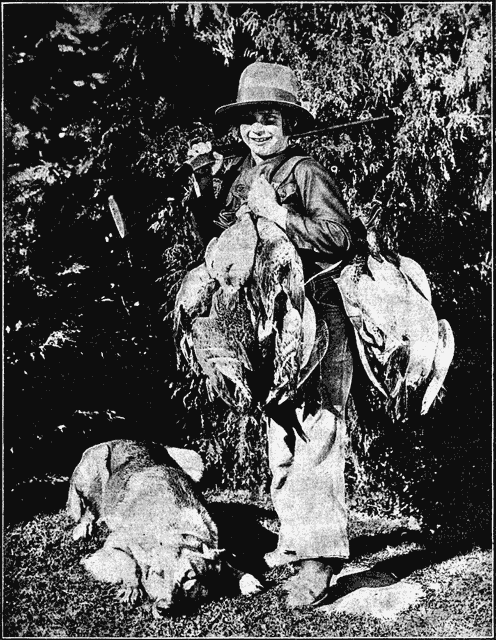 Знаменитый герой экрана, маленький артист Джеки Куган, превратился ныне уже в подростка и, разбогатев, приобрел себе в Калифорнии ранчо, которое обошлось ему в 250.000 долларов. Его ранчо находится в Лагунных горах и изобилует дичью. На нашем снимке — Джеки Куган, возвращающийся с удачной охоты. Он обвешан множеством дичи, жертвами его винтовки и меткого глаза.