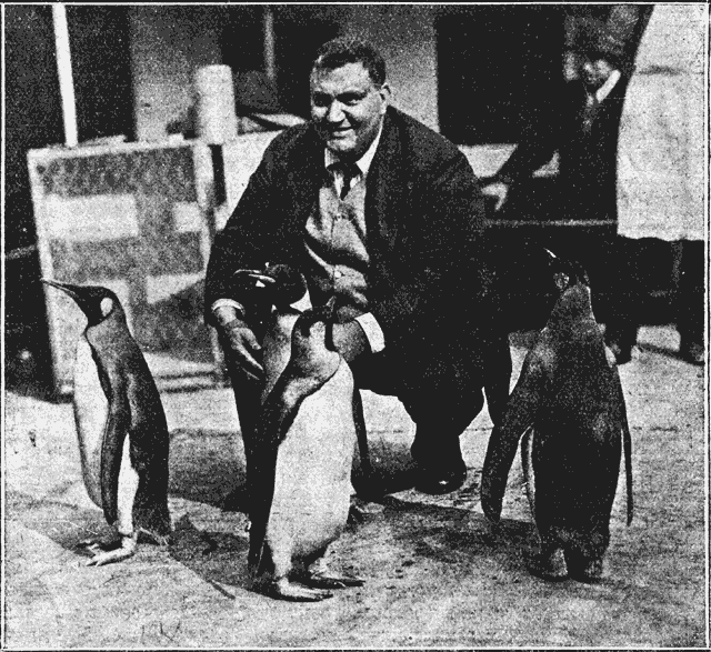 Пингвины, о которых так много рассказывают южно-полярные мореплаватели, плохо выживают в американских и европейских зоо-парках. Особенно редким видом пингвина считается крупный королевский пингвин. На нашей фотографии представлен известный американский торговец дикими животными Эллиа Джозеф, снятый на палубе парохода «Балтик», с четырьмя королевскими пингвинами, которых он везет в Нью-йоркский зоо-парк.