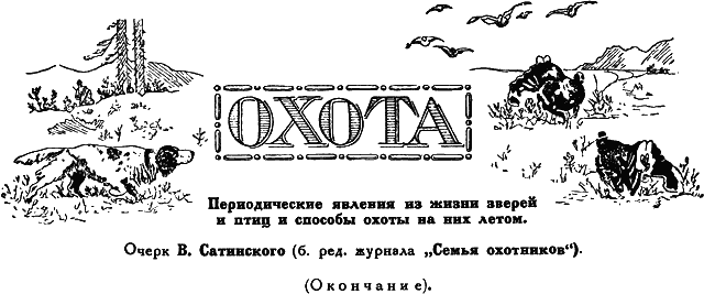 Дупель. В срединных губерниях ток в начале первой половины июля начинает сходить на нет. Самки садятся на яйца (четыре штуки) и сидят семнадцать-восемнадцать дней. Самцы начинают линять и забиваются в крепи. На юге в конце первой половины уже выклевываются дупелята. При хорошо сложившейся весне — в последних числах выводки и в центральных губерниях. В половине июля заканчивается линька стариков. Подросшая молодежь перебирается из крепей в открытые луговые болота, травянистые кочкарники, в топкие, вблизи хлебов, места; день проводят в хлебах, ночь — в болоте; в большие жары не покидают болот и днем. Первые две трети августа подравнявшаяся уже со стариками молодежь держится, выжитая из хлебов начавшейся уборкой, по парам, луговым некосям, по кочковатым с кустиками болотам, вблизи некосей. Чем мокрее лето, тем в более сухих местах надо искать дупеля. В холодные и сырые дни держится по высоким, вблизи болот лежащим буграм. В конце августа переселяется в более крепкие места и начинает стадиться. В последних числах начинаются первые высыпки и появляются уже пролетные из северных губерний. Охота с собакой с 1 августа.