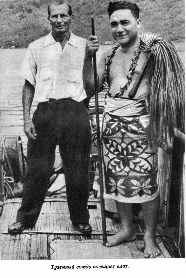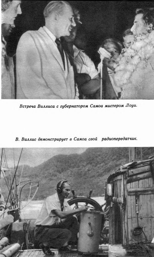 Ночью то и дело налетали шквалы, но держался устойчивый и крепкий ветер. Океан сильно волновался. Я правил на юго-запад. Время от времени я засыпал. Иногда показывалась луна, но тут же скрывалась в низко нависших тучах. После полуночи океан разбушевался вовсю, и ветер завывал во мраке. Хлынул дождь. Все имевшиеся у меня посудины я заполнил дождевой водой, подвесил две из них к парусу, как это проделывал севернее Маркизских островов. Микки улеглась возле компаса. — Микки, — сказал я, — просыпайся, мы держим курс на землю. Микки приоткрыла один глаз, потом другой, затем широко раскрыла оба. Потом зевнула, показывая белые зубы, и лениво потянулась, выгибая спину. Во время дождя ветер несколько изменил направление, но потом стал дуть по-прежнему, что позволило мне снова лечь на выбранный мною курс. Небо слегка прояснилось. Пока собирался дождь, было несколько вспышек молний. Последние дни частенько поблескивали молнии. Занялся серый рассвет; небо было окутано тучами. Едва забрезжил свет, я достал бинокль и направился на носовую часть плота. Сперва я ничего не мог разглядеть. Но через полчаса, когда я стоял у штурвала, Тау появился из-за туч, и его можно было видеть без бинокля. Казалось, остров был подвешен к моему бушприту. Немного правее виднелись голубоватые островки, увенчанные седлообразными хребтами, это были Олосега и Офу. В 7 часов 45 минут утра я снова послал в эфир на обеих частотах сообщение: «7HTAS (мои позывные). Плот в двадцати пяти милях от Тау. Нуждаюсь в помощи при высадке. Все в порядке. Виллис». Это сообщение, как и накануне, я дважды простучал ключом. Было 12 октября, и я вспомнил, что это день памяти Колумба — весьма подходящий день для высадки на берег. Уже прошло сто двенадцать дней со времени отплытия из Кальяо. Около одиннадцати часов утра плот находился на расстоянии полумили от северного берега острова Тау, держа курс прямо на горы, покрытые густой зеленой растительностью. Сильный ветер гнал плот к острову. Небо было ясное, океан озаряло яркое, но еще низкое солнце. На вершине Тау лежало тяжелое облако. Гряда облаков застилала острова-близнецы — Олосега и Офу. Я поднял флаги. Над кормой взвился американский флаг. На верхушке грота развевался флаг Перу, страны, из которой я отправился в плавание; эквадорский флаг олицетворял страну, где построен плот, и, наконец, британский флаг был поднят в честь сэра Джорджа Нельсона, подарившего мне радиопередатчик. Я направился к северному берегу острова Тау. Не зная ветра и течений под крутыми склонами гор, я весьма осторожно вел плот. В лоции говорилось, что с этой стороны остров окаймлен рифами и что в пятнадцати морских саженях от его северо-западной оконечности имеется якорная стоянка, но она считается опасной. Не было никакого смысла бросать здесь якорь, вдобавок у меня на плоту не было достаточно длинного и надежного каната, чтобы отдать якорь на глубину около сорока морских саженей. В лоции также сообщалось, что на северном берегу острова (следовательно, влево от меня) расположена небольшая деревушка. Приближаясь к острову, я рассматривал берега в бинокль, в надежде увидеть какое-нибудь жилище. Берег был крутой и опасный, волны с грохотом разбивались о грозный красноватый риф. Ни залива, ни прохода не было видно, и, повернув направо, я погнал плот вдоль побережья, под сенью крутых зел