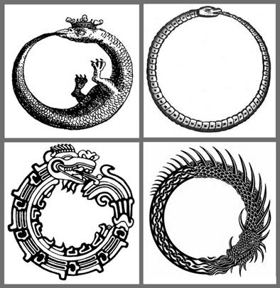 Уроборус — это символ Мирозданья, как это, возможно, не покажется кому-то слишком патетичным. Проиллюстрировать это можно так: многие в фотошопе увеличивали картинку до максимума и в итоге видели один пиксел. От разрешения это не зависит — имидж в самом высочайшем разрешении складывается из пикселей. А если уменьшить картинку до минимума — тоже получим один пиксель. В математике числа идут бесконечно в обоих направлениях, но и в физике есть понятие о конечных крупных и маленьких размерах. Космический Уроборус представляет вселенную как масштабируемую непрерывность величин от большого размера к малому, из которых наибольшее и наименьшее могут быть связаны действием силы тяжести. Есть и другие связи между крупным и мелким, к примеру, электромагнитные силы. Шестьдесят порядков отделяют самые маленькие величины от самых крупных. Начиная с головы Змея по направлению к хвосту мы идём от огромнейших масштабов космического горизонта, видимой вселенной, сверхскоплений галактик, одной галактики, от солнечной системы к солнцу, луне, горам, человеку, одноклеточным существам, к нити ДНК, к атому, ядру, масштабам слабых взаимодействий и приближаемся к хвосту чрезвычайно малых размеров — величин, с помощью которых физики надеются найти доказательство суперсимметрии, частиц темной материи. Тонкий хвост глотает огромная пасть — и малое вновь становится большим… Понятие «Уроборус», возможно, лучше выражает «непрерывность» вселенной, чем лента Мёбиуса, где нет точки отсчета. Кончик хвоста змея соответствует длине Планка, а его голова — видимой вселенной.