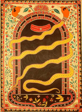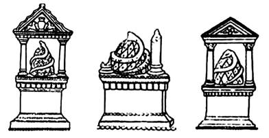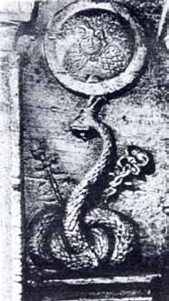 На рельефе из александрийских катакомб ком-эш-Шукафа (конец I в. от Р.Х.) священный Змей, культ которого был распространен в северной африке, Малой азии и Причерноморье, в своих кольцах сжимает два скипетра: Тирс Диониса и кадуцей Гермеса. Над головой рогатого Змея сфера с крылатой головой Медузы. Диск этот — апотропей — знак, отпугивающий злые силы, в данном случае стерегущий покойников. В древней Руси аналогами апотропеев служили "змеевики".