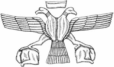 "Смотрит одновременно на запад и на восток". Значения, которые вкладывают в символ двуглавого орла, можно долго перечислять. Но лучше обратиться к первоисточнику. Несомненно, это орёл из Лагоша на рельефе стелы Эаннатума, датируемый третьим тысячелетием до Рождения Христа. Время I династии Ура. На стеле бог Нингирсу водружает орла (анзу) над клеткой с пленниками. Символика этого действия не нуждается в толковании — она очевидна — абсолютная власть над покоренными народами. Нингирсу (владыка Гирсу), с титулом "Царь оружия", — более древнее, шумерское, имя вавилонского Нинурты. Нинурта в переводе означает "владыка Земли". Нингирсу — сын Энлиля. Тотем Нингирсу — птица анзу, которую он победил. Изображали её как с двумя головами, так и одной, "львиной". И с львиной головой гораздо чаще, поскольку ранее эмблемой Нингирсу был лев. Химерический символ вобрал в себя два значения.