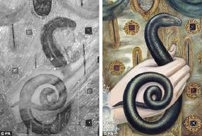 Слева в инфракрасных лучах, справа — восстановленный фрагмент. Галерея предположила, что удаление змеи с портрета могло быть связано с тем, что символ трактовался неоднозначно. Но когда это было сделано — неизвестно. Так же в анонсе было сказано, что "змея в основном черная, с синезелёным оттенком и что написана она "по воображению". "Скипетр" в руке королевы Бесс принял изначально заложенный в него смысл. Основные символические значения, которыми искусствоведы объясняют этот предмет: "ось мира", божественная власть, полномочия и, разумеется, фаллос. Орган возрождения и плодородия. В этом пункте им вторят психологи: Фрейд объяснял скипетр в руках монархов эксгибиционизмом, тайным стремлением показать всем свое мужское достоинство, и, дескать, если мужчина увидит скипетр во сне — значит, стесняется размеров своего полового члена и склонен к самоудовлетворению. А если женщина увидит — она желает грубого секса. Мы еще раз можем убедиться, что не всегда стоит обращаться за помощью в толковании символики к людям, которые что бы ни видели, что бы ни представляли и о чём бы ни думали всегда воображают, что дело так или иначе связано с фаллосом, венерой, и всегда будут это относить к известному всем процессу.