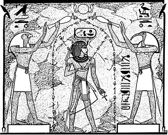 На самом деле никто толком не знает, как выглядели кожистые яйца динозавров — по окаменелостям это трудно определить. Палеонтологи, основываясь на найденных отпечатках в камне, в последнее время склоняются к мысли, что большинство динозавров имели перья, такие же, как у птиц. Вполне вероятно, что яйца имели чешуйчатую поверхность. С точки зрения "динозавров в перьях" несколько по-другому смотрится описание шумерских стражей, "одетых в перья". Разумеется, если, глядя на рельефы, утверждать, что шумерских царей представители инопланетных рас модифицировали помазанием с помощью собственных яиц, так же не разумно, как настаивать на том, что символ сердца произошел от символа задницы. Особая любовь к сосновым шишкам тоже у древних ничем не оправдывается, если это только не особые "шишки", которые доставляли в опечатанных ящиках с севера, из Гипербореи, в храм аполлона, о чём есть записи в античных хрониках. Но поскольку проверить содержимое тех ящиков теперь возможности не представляется, отнесем всё это к тем "таинствам", мистериям — обрядовым действиям. Механизмам и процессам, смысл и предназначение которых нам недоступно. В Египте обряд помазания фараона схематически выглядел таким образом. Вв обряде участвуют Гор и Тот. Гор — покровитель египетских фараонов, бог Неба. Греки сопоставляли Гора с аполлоном, видя в нём бога света. Тот — бог Луны, его отождествляли с Гермесом. "Масло" схематически изображено в виде потока крестов (символов жизни анкхов) и осей (символов власти Уасов).
