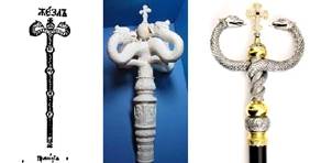 Кадуцей и цветущий тирс с шишкой в результате победы монотеизма над язычеством стали одним целым, если проследить эволюцию этих предметов. Примерно так, как анкх, джед и уас, под объединяющим знаком рогатого Змея, трансформировались в единый символ. Или, если хотите, как серп и молот, которые, будучи реальными предметами, соединились в знак с уже другим смыслом. Понятно, что джед, к примеру, когда-то имел вполне определенную функциональность, как и серп. А массово-габаритная модель джеда — только символ джеда, его обозначение. Серп тоже можно сделать из камня, только работать им будет невозможно. В древности маги, жрецы, фараоны, цари — все носили скипетры в подражание настоящим властителям, тем, у которых и скипетры были настоящие. Ведь у кого винтовка не игрушечная — тот и стреляет. Винтовка рождает власть. Библейский эпизод с соревнованием левитов здесь показателен. Нужно было выбрать из множества липовых священников, которые похвалялись своим искусством и связью с Богом, настоящих. Все они были похожими на жрецов и все вооружены жезлами. Но только жезл аарона расцвел. А жезл Моисея, трансформировавшись в змею, поглотил жезлы египетских жрецов. Это говорит о том, что уже в те древние времена наряду с настоящими существовали "культовые" предметы, которые были имитациями подлинных, их символами. Конечно, можно считать, что эти жезлы, посохи и скипетры не представляли собой технических устройств, а наделялись энергией, качествами для управления людьми и воздействия на объекты свыше. То есть, неважно, какой был посох у Моисея и из какого материала он был сделан, — важно, что им обладал именно Моисей, которого энергией для чудес снабдил Господь. Эта версия тоже имеет право на существование, и именно ее поддерживает Церковь, если речь идет о "Знаке Пастырской власти". Версия немного сомнительна, поскольку история "змеиного" посоха Моисея, имеющего египетское происхождение, изложена достаточно подробно в библейских источниках. Посох обладал собственной силой, а вот для того чтобы управлять им, Моисею пришлось пройти курс обучения у самого Господа Бога.