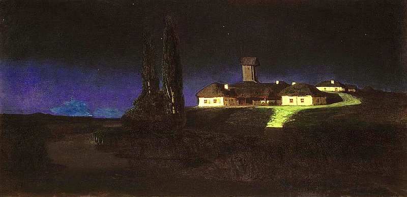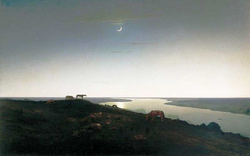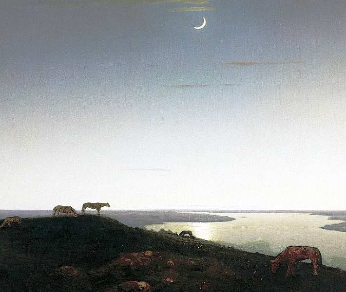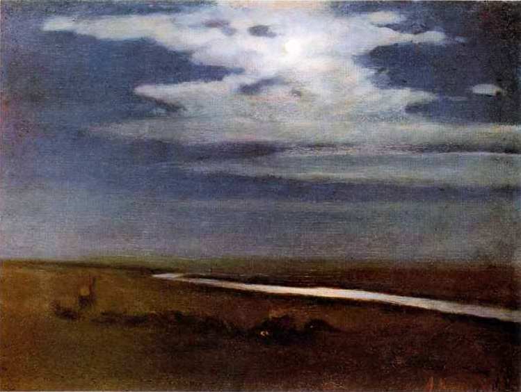 Глубоко поэтичное восприятие природы словно сомкнулось у Куинджи в картине Ночное с романтической тенденцией, породив произведение со сложной романтико-реалистической структурой образа. В Ночном — прощальном произведении Куинджи — воплотились воспоминания детства и пристрастие к созерцанию неба. Элегичность, некая прощальность, лирическая грусть заставляют минорно звучать бледные краски горизонта, томительно светиться гладь реки. Своим творчеством Куинджи опередил время, открыв новое романтическое движение, вырвавшееся на простор XX века. Художник заложил основы романтического искусства и остановился, словно ожидая подкрепления. И оно пришло, но в следующем столетии.Вечер на Украине. 1878-1901