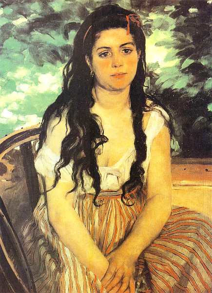 Ренуар написал много портретов детей, с любовью наблюдал за их жестами и выражениями лица. В данном случае, еще связанный академической манерой, он черпал вдохновение в «Портрете инфанты Маргариты» Веласкеса (внизу, 1659, Вена, Музей истории искусства). Дачный портрет. Картина была заказана родителями девочки во время их отдыха в деревне Барбизон в лесу Фонтенбло, ставшем раем для художников. Так называемая «Барбизонская школа», основанная Теодором Руссо, сыграла большую роль в зарождении импрессионизма.