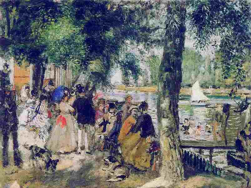 «Лягушатник» (1869, Москва, Музей изобразительных искусств). Летом 1869 года Ренуар часто ездил вместе с Моне в Буживаль, на берег Сены: оба неоднократно писали купальню, именуемую Лягушатником.
