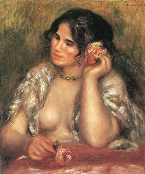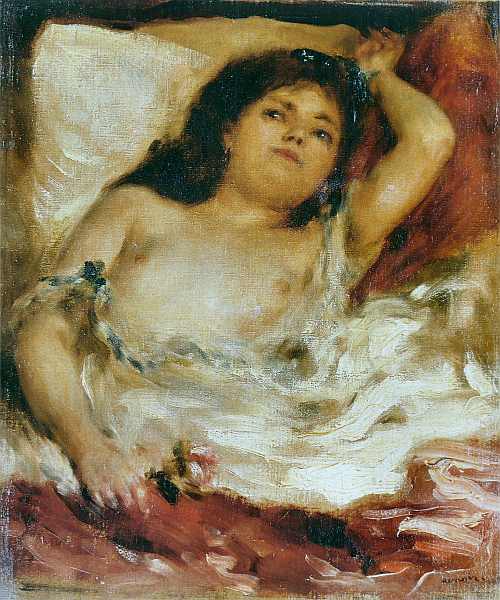 «Лежащая женщина» (1872, Париж, музей Орсе). Это одна из первых картин, где Ренуар находит органичное сочетание розы и лица (или тела) женщины. В дальнейшем он всегда будет верен этой детали.