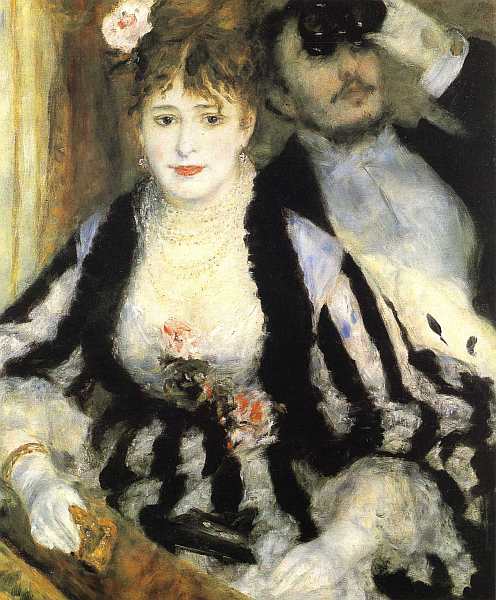 В «Ложе», написанной, когда Ренуару было тридцать три года, запечатлен момент жизни, полный простой и чистой красоты. Модель, Нини Лопес, известная на Монмартре под прозвищем «Точеные губки», была в тот период любимой натурщицей художника. Великолепное лицо с классически правильными чертами предстает на картине во всем своем блеске, подчеркнутом контрастом черного и белого цветов ее платья. «Черный цвет, — говорил Ренуар, — король всех цветов». И именно блестящий, отливающий разными цветами черный определяет границу между женской фигурой на первом плане и мужской сзади, в полумраке, еще больше оттеняя ослепительную белизну рубашки, руки в перчатке, держащей бинокль, жемчугов на шее Нини, горностая на ее плечах и прелестного, нежного декольте. Эффект, производимый композицией в целом, делает эту картину одной из самых приятных и гармоничных картин Ренуара.
