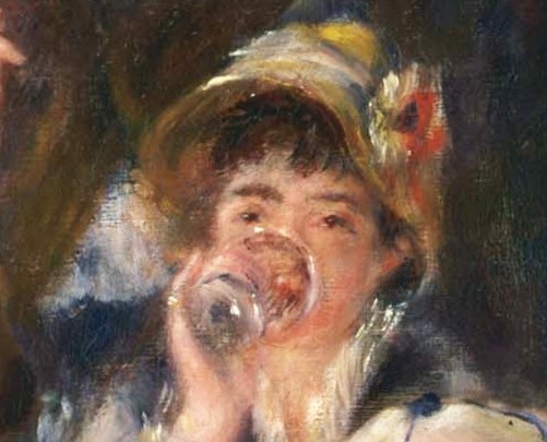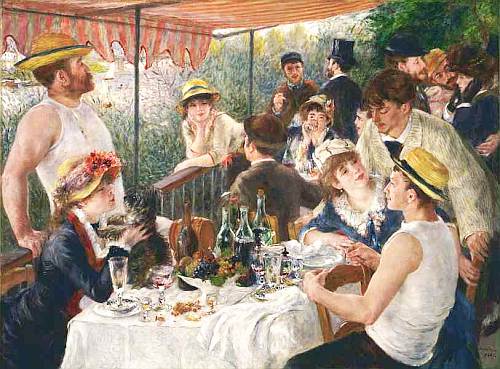 Многие друзья Ренуара позировали для этой большой композиции, чтобы фигуры получились более реалистичными. В группе, сидящей за столом, мы видим натурщицу Жанну и ее сестру Эстеллу, Жоржа Ривьера и франка Лами; среди танцующих можно узнать Лота, Лестринге, Жерве, Корде и других. В центре зала танцует Марго, молодая натурщица, умершая всего два года спустя. Для создания этой большой картины, написанной с натуры в саду популярного кабачка на Монмартре, Ренуару пришлось преодолеть немало трудностей. Только благодаря помощи друзей ему удалось перетащить холст из своей мастерской на улице Корто, в этот сад, где свет, играя, проходил сквозь листву акаций, усыпая землю и одежду танцующих голубыми и розовыми бликами. До сих пор Ренуар работал исключительно над портретами отдельных людей, здесь же впервые он взялся за композицию из многочисленных фигур в движении, к тому же в сложном освещении, где солнечный свет взаимодействовал с фонарями танцплощадки. Это изображение дышащей молодостью толпы представляет собой одно из высших достижений импрессионизма, всегда стремившегося запечатлеть мгновение, выхватить один какой-нибудь момент из беспрестанного течения жизни. Великолепное соответствие композиционного решения тематическому разнообразию картины делают ее одним из шедевров Ренуара.Завтрак лодочников