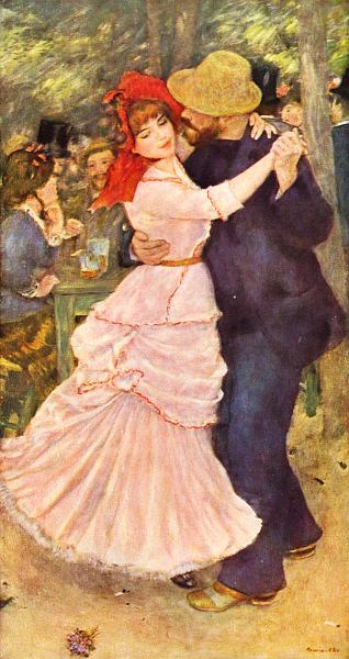 Впервые выставленная в галерее Дюран-Рюэля весной 1883 года, эта картина представляет собой одну из частей написанного в те годы триптиха, посвященного танцу. В нем нашло воплощение увлечение Ренуара нравами эпохи, женскими нарядами и шляпами, которые он коллекционировал и заказывал специально своих моделей. Как и в других картинах художника, в сцене доминирует женская фигура. Красивое лицо, обрамленное красной шляпой с завязанными под подбородком лентами, изогнутая линия тела, захваченного ритмом танца, и взгляд, уходящий в сторону от настойчивого приближения партнера, сразу же привлекают внимание зрителя. Мужская же фигура, напротив, остается как бы анонимной, лицо наполовину скрыто под соломенной шляпой, а тяжеловесность темной массы костюма еще больше оттеняет воздушную легкость девушки. Необычайно плавные цветовые переходы замечательно передают атмосферу пленэра.