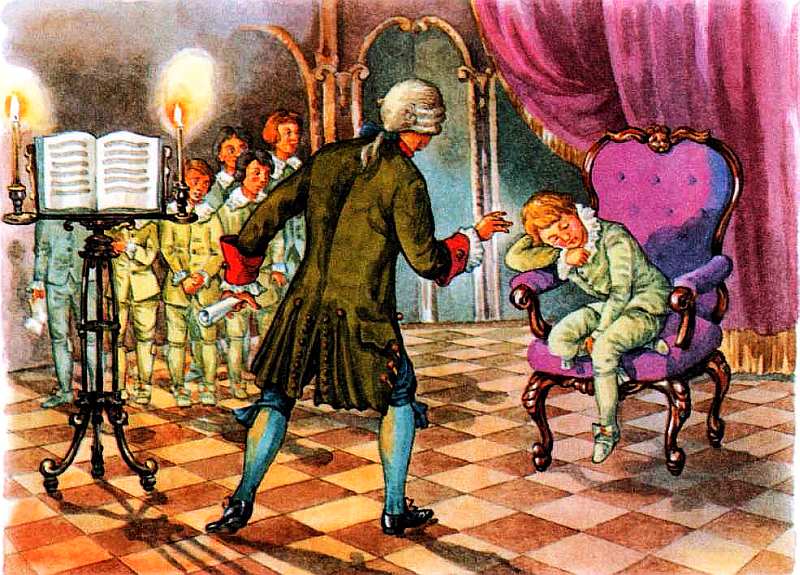Было это 240 лет назад. В Санкт-Петербурге в роскошном и пышном дворце пел хор. Пылали свечи. Изредка на вытертый до блеска паркет с шипеньем капал воск. Дамы в белых кружевных платьях, кавалеры в расшитых камзолах благоговейно молчали. Время от времени вступали солисты. Вслед им гремел хор. Прекрасная и возвышенная музыка переполняла залу. И вдруг все смолкло. Капельмейстер в страхе так и застыл с поднятой правой рукой. Придворные нахмурились: в чем дело? Что за глупая пауза? И в тишине этой стало слышно: кто-то тонко, с присвистом, на всю залу посапывает. Ну а затем уж все — и хор, и капельмейстер, и придворные увидели: опустившись в глубокое, стоящее чуть поодаль от поющих кресло, спит мальчик-солист. И хор не может двинуться вперед, пока этот самый маленький хорист не пропоет свою партию.