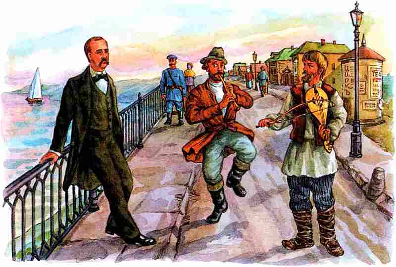 Неожиданно из-за театральной тумбы появились двое мужичков. Они были в лаптях и держали в руках какие-то необыкновенные музыкальные инструменты. Они свистели и кривлялись, пели и пританцовывали. Что-то старинное почудилось Бородину в их напеве. Он поманил мужичков пальцем.