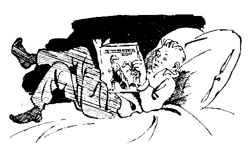 Стенные часы гулко пробили один раз. Половина десятого. Генка учился на второй смене, до школы времени оставалось еще много. Не раздумывая, он взял книгу, прыгнул в кровать и, подтянув повыше подушку, стал рассматривать картинки. Правда, на какую-то секунду в его сердце шевельнулась легкая тревога: уроки-то он не подготовил. Но тут на глаза попался новый рисунок — рыжий тигр с длиннющими, как сабли, клыками,- и нерешенные арифметические задачи показались легкими и не страшными.
