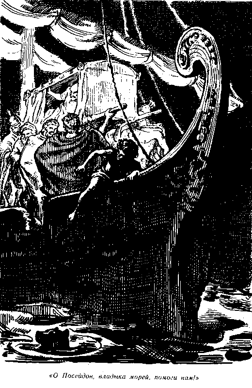 Клеон схватил одной рукой Льва за ошейник, а другой уцепился за столбик, поддерживавший какой-то навес. Но в следующую минуту миопарона встала на дыбы, рука Клеона от толчка разжалась, мальчик и собака покатились под ноги Гликону. — Убирайтесь под палубу, если не умеете держаться на ногах! — заорал Гликон, отшвыривая Клеона. Лев метнулся к обидчику, и… зубы его щелкнули в воздухе: миопарона ткнулась носом в волны, и, вместо того чтобы вцепиться в ногу Гликона, изумленный пес отлетел в сторону. На этот раз Клеону и Льву удалось задержаться возле мачты. Решив, что центр судна — самое безопасное место, Клеон сдернул с себя пояс и, пропустив один конец его под ошейник Льва, другой закрепил на мачте узлом, которому научили его рыбаки: в случае опасности узел этот можно было развязать одним рывком. От нового толчка Клеон чуть не упал и, обхватив мачту обеими руками, прижался к ней. На палубе все металось, звенело, стучало… Над их головами вздувался парус. Когда ветер на мгновение утихал, было слышно, как он хлопает. И Лев, думая, что парус им угрожает, лаял на него. Со всех сторон вздымались мутно-зеленые горы воды. С неба свисали черно-синие тучи. Казалось, что волны и тучи вот-вот сольются и раздавят корабль… Но легкая миопарона задирала нос и, скрипя и охая, лезла на водяную гору. Достигнув вершины, она подбрасывала зад, как норовистая лошадь, и стремительно летела вниз. Канат, который удерживал лодку, лопнул, и она затонула. Скрипели снасти. Выл ветер. Грохотало море. За воем и громом не слышно было приказаний Церулея, и матросы больше по догадке то натягивали, то отпускали канаты паруса. Клеон чувствовал зависть к этим людям. Пусть рвущиеся из рук снасти обдирают в кровь их ладони — они не замечают боли, не чувствуют страха, они думают только о спасении судна. А Клеону так страшно стоять, ничего не делая! Впервые в жизни он понял, как тяжело в минуты общей опасности оставаться праздным. Чтобы побороть страх, надо было что-то делать, и Клеон обратился с мольбой к богам: «Боги бессмертные! Простите меня за то, что я упрекал вас в жадности. Мало ли что сболтнет язык… Неужели из-за моих глупых слов погибнет столько людей?.. И Лев?! Разве его преданность не заслуживает награды?.. О Посейдон,[14] владыка морей, выведи нас из пучины! За это я принесу тебе в жертву свою первую бороду.[15] Пусть поразит меня Зевс Громовержец, если я тебя обману!» Некоторое время корабль продолжал идти на северо-запад. Улучив минуту, когда ветер несколько стих, кормчий взмахом руки указал на восток, и Церулей выкрикнул какое-то приказание. Матросы начали поспешно отпускать якорные канаты. Кормчий и Гликон налегли на кормила. Жилы на их лбах вздулись. Одно кормило с треском сломалось. Паруса бешено захлопали. Лев захлебнулся лаем. Судно со стоном повалилось на бок. Сейчас оно перевернется!.. Клеон схватил конец пояса, чтобы освободить Льва, если придется броситься в воду. Но миопарона уже успела повернуться и медленно выпрямлялась. Ветер насел на корму. Парус выпятился вперед… Миопарона полетела к италийским берегам. Клеон слышал много рассказов о кораблекрушениях в Тирренском море. Он вырос на побережье, среди рыбаков, и понимал, что в эту бурю их спасал только узкий корпус миопароны, нырявшей в волнах словно дельфин. Но все же невозможно было следить без страха за тем, как стремительн