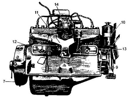 1 — водомасляный радиатор; 2 — генератор; 3 — прерыватель-распределитель; 4 — стартер; 5 — топливный насос; 6 — водяной насос; 7 — картер маховика; 8 — картер двигателя; 9 — блок цилиндров; 10 — масляный фильтр; 11 — всасывающий и выхлопной коллекторы; 12,13— крышки клапанной коробки; 14— карбюратор