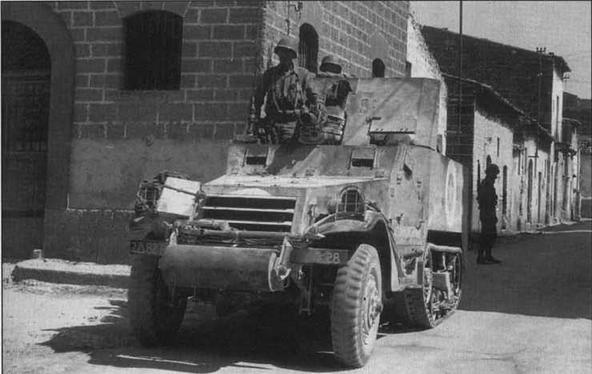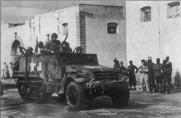 Бронетранспортер М3 на улице марокканского города. Северная Африка, ноябрь 1942 года. Обращает на себя внимание наращенная выхлопная труба, что позволяло машине при высадке с десантных кораблей вброд преодолевать полосу прибоя