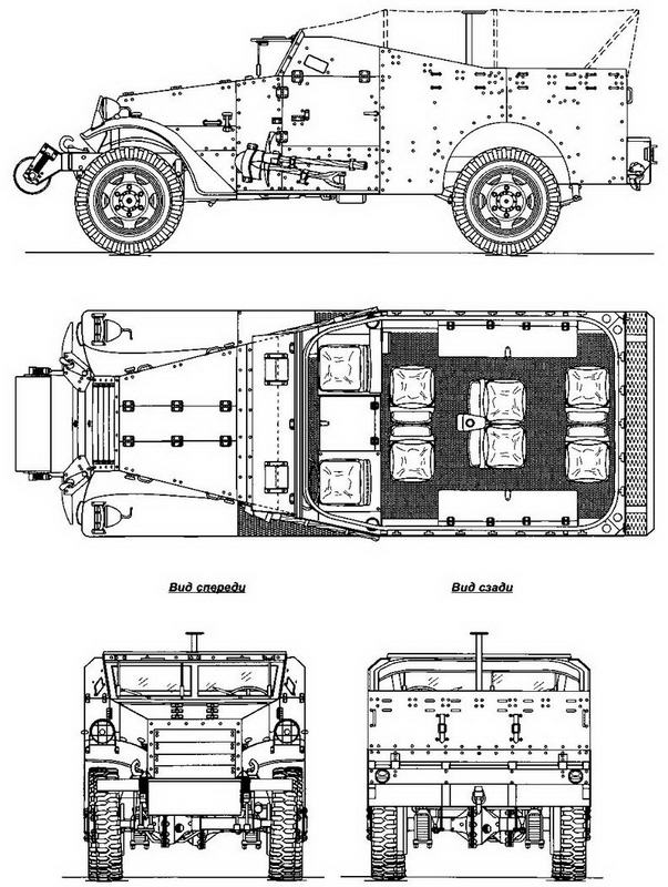 М1 оснащалась карбюраторным 6-цилиндровым двигателем Hercules L рабочим объемом 4,6 л и мощностью 75 л.с. Открытый сверху корпус машины имел 12,7-мм лобовую, 7,62-мм кормовую и 6,35-мм бортовую броню, обеспечивавшую защиту от пуль и мелких осколков снарядов. Вооружение разведчика было очень мощным: два 12,7-мм крупнокалиберных пулемета Browning М2 в передней части корпуса и два 7,62-мм Browning М1919А4 по его бортам. Следующей модификацией «скаута», принятой, как и предыдущая, в ограниченном количестве на вооружение армии США, стал М2. Прототип этой машины T9 в 1935 году разработала фирма Corbitt & Со, попытавшаяся потеснить White. В качестве базы по-прежнему использовалось шасси коммерческого грузовика, но на нем устанавливался 8-цилиндровый двигатель Lycoming New Corbitt Eight мощностью 95 л.с. Компоновка машины особых изменений не претерпела, а вот вооружение сократилось до двух пулеметов М1919А4, располагавшихся по бортам корпуса. Главным отличием варианта М2А1 стал рельс-шина, охватывавший по периметру весь броневой кузов. На этом рельсе с помощью специальных подвижных захватов устанавливались и могли перемещаться пулеметы. Еще одной версией «скаута» М2 стал самоходный миномет Т5Е1. В кузове машины в горизонтальном положении перевозился 4,2-дюймовый миномет. Для ведения стрельбы последний с помощью специального складывающегося механизма ставился на грунт позади бронетранспортера. В 1935 году к проектированию «скаутов» приступила и фирма Marmon-Herrington из Индианаполиса. На суд военных был представлен бронетранспортер-разведчик A7SCA, аналогичный по своим характеристикам М2. Он оснащался 8-цилиндровым двигателем Ford V8 мощностью 85 л.с. и развивал скорость до 120 км/ч, однако американскую армию не заинтересовал. Чуть больше повезло другой машине — Т13, созданной на шасси коммерческого 1-т грузовика Ford-Marmon-Herrington: 38 единиц в 1937 году заказала Национальная гвардия. Пока эти две фирмы соревновались между собой, Wihte продолжала заниматься модернизацией М2А1. Бронетранспортер получил новый 5-литровый двигатель Hercules JXD мощностью 110 л.с. Подверглась изменениям и форма корпуса. В частности, броневой лист перед радиатором расположили под наклоном, что повысило его пулестойкость. В 1938 году эта машина была стандартизирована Военным департаментом США под обозначением М3, но производилась опять-таки в небольших количествах — за два года заводские цехи покинуло всего 64 единицы. Все они поступили на вооружение 13-го кавалерийского полка 7-й механизированной кавбригады. Исходя из положительного опыта их эксплуатации, командование армии США приняло решение об оснащении всех кавалерийских частей машинами подобного типа. Вскоре фирма White предложила военным усовершенствованный вариант этого бронетранспортера — M3А1. Его и запустили в большую серию.