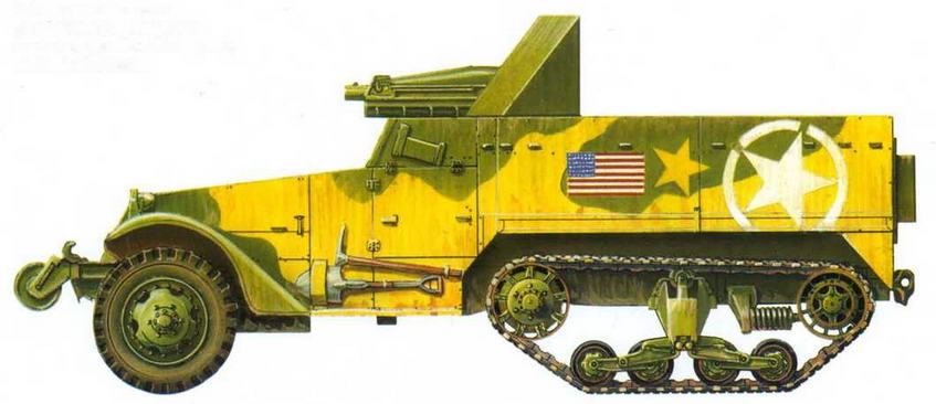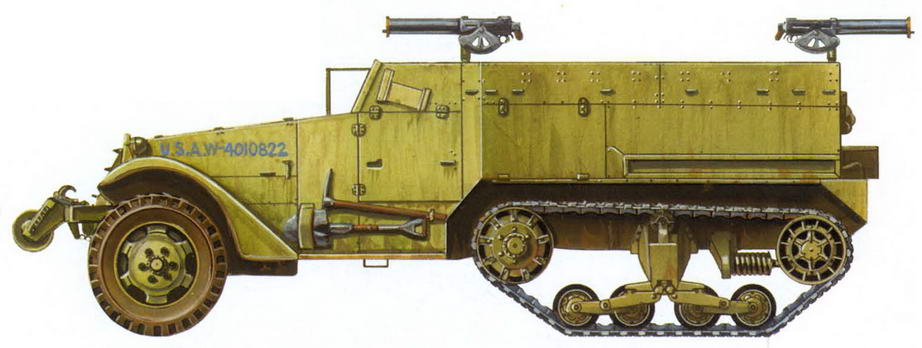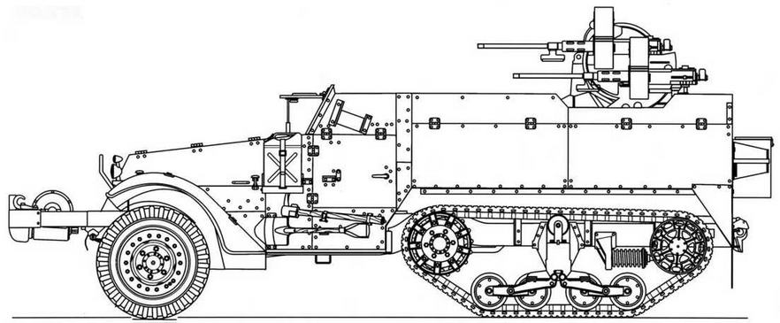 Разработка семейства полугусеничных бронетранспортеров «хаф-трэков», одного из наиболее известных и популярных среди боевых машин союзников в период Второй мировой войны, началась в США с 1932 года. К проектированию приступили сразу четыре фирмы: James Cunniagham and Sons, Linn, GMG и Marmon-Herrington. Прототипом послужило французское шасси Citroen- Kegresse C417, несколько образцов которого американцы закупили годом ранее. В течение пяти лет создавались и испытывались опытные образцы полугусеничников вариантов от Т1 до Т9Е1. Последний, признанный наиболее удачным, базировался на шасси грузового автомобиля Ford V-8 с колесной формулой 4x2. Задний мост был заменен гусеничным движителем фирмы Timken с резинометаллической гусеницей. В 1938 году таким движителем оборудовался бронированный автомобиль-разведчик Scout Саг М3, что подтолкнуло еще одну фирму — Diamond Т Motor Company — к созданию в 1940 году прототипов Т14 и Т8. Стремительное развитие событий в Европе, падение Польши, Бельгии, Голландии и Франции заставило американцев форсировать работы. В результате уже в октябре 1940 года Т14 и Т8 были стандартизированы (то есть приняты на вооружение армии США) как М2 Half- Track Саг и М3 Half-Track Personel Carrier соответственно. При этом первый представлял собой полугусеничный артиллерийский тягач, а второй — бронетранспортер.
