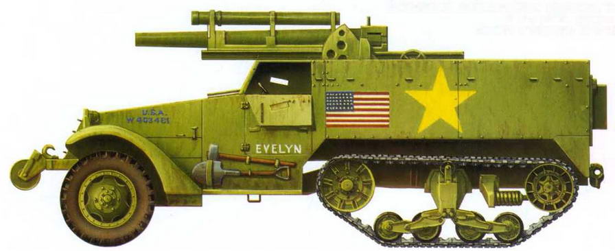 Кроме противотанковых САУ на шасси полугусеничных бронетранспортеров, в США создавались и боевые машины другого назначения, использовавшиеся для огневой поддержки пехотных и мотопехотных частей. В октябре 1941 года на вооружение армии США был принят самоходный миномет М4 (М4 81 mm Mortar Motor Carriage). Он представлял собой бронетранспортер М2, в кузове которого размещались 81-мм миномет, расчет из трех человек и 126 выстрелов боекомплекта. Машина эта предназначалась только для перевозки миномета, ведение огня было возможно лишь с грунта. В экстренных случаях можно было стрелять и с машины, но огонь при этом не был прицельным, поскольку миномет не закреплялся. До октября 1942 года компания White Motor Со. изготовила 572 машины М4, которые поступили на вооружение штабных рот всех мотопехотных и танковых батальонов, по четыре единицы на каждый. В войсках без восторга встретили новую машину, главным образом из-за невозможности вести огонь с борта. Поэтому в том же месяце по заказу Военного департамента началась разработка нового самоходного миномета Т19 на шасси бронетранспортера М3. Однако его проектирование затянулось, и на вооружение приняли модернизированную версию "четверки" — самоходный миномет М4А1, оснащенный оборудованием, позволявшим вести прицельный огонь непосредственно из кузова машины. Неудовольствие артиллеристов теперь вызывало лишь размещение миномета в кузове стволом назад, требовавшее разворота бронетранспортера на позиции. Поэтому в войсках многие из 600 выпущенных с мая по октябрь 1943 года М4А1 подвергались переделке — узлы крепления миномета переставляли таким образом, чтобы обеспечить ведение огня вперед. Тем временем в июле 1943 года на вооружение наконец приняли самоходный миномет на шасси М3, стандартизированный под обозначением М21. В отличие от предшественников, миномет на этой машине установили в средней части кузова стволом вперед. Ведение огня было возможно в секторах 30° в обе стороны от оси машины. Угол возвышения — от 40° до 80°. В случае необходимости миномет демонтировался, и после установки штатной опорной плиты огонь велся с грунта. Вспомогательное вооружение М21 состояло из крупнокалиберного пулемета, крепившегося на стойке в кормовой части кузова. Поскольку потери боевых машин этого типа были невелики, а самоходный миномет М4А1 вполне удовлетворял армейское командование, новых машин выпустили немного. С января по март 1944 года компания White изготовила 110 единиц, из которых 54 сразу же передали войскам "Свободной Франции". Других поставок по ленд-лизу машин М4, М4А1 или М21 не было. Что касается минометов более крупного калибра, то в декабре 1942-го начались работы по созданию машины Т21, представлявшей собой бронетранспортер М3, вооруженный 107-мм минометом. Последний размещался в кузове БТРа с использованием таких же приспособлений, что и 81-мм миномет в М4А1. В связи с началом проектирования самоходного миномета Т27 на гусеничном шасси, работы по Т21 прекратили. В 1941 году Военный департамент разработал тактико-технические требования к штурмовому орудию для оснащения танковых и разведывательных мотопехотных подразделений. Первый прототип был готов в октябре того же года и представлял собой бронетранспортер М3, вооруженный 75-мм гаубицей М1А1. Компоновку боевого отделения, включая установку орудия, заимствовали у противотанк
