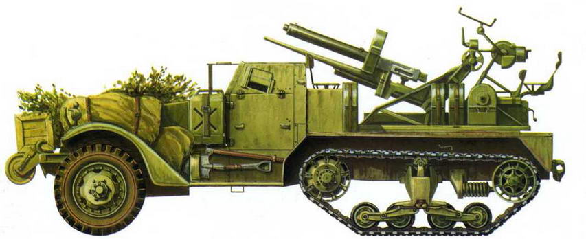 Что касается ЗСУ М17, то вся партия из 1000 выпущенных машин была отправлена в Советский Союз. Начиная с 1944 года они поступали на вооружение зенитно-артиллерийских полков механизированных и танковых корпусов, а также зенитно-артиллерийских дивизий танковых армий (10 — 20 единиц на соединение). Это были единственные ЗСУ на вооружении Красной Армии в период Великой Отечественной. За счет высокой скорострельности (2000 выстр./мин на установку) они оказались весьма эффективными при отражении атак немецкой авиации на малых высотах. Советское командование быстро оценило мощь огня этих ЗСУ и часто включало их в состав передовых отрядов наступающих танковых частей. Обычно в таком отряде имелось семь — девять танков Т-34, четыре ЗСУ М17 и несколько "скаутов" M3А1 с мотострелками или разведчиками. При удачном развитии событий таким группам нередко удавалось внезапным ударом захватывать отдельные населенные пункты, мосты или узловые железнодорожные станции. Как и в американской армии, ЗСУ часто использовались для огневой поддержки оборонявшихся или наступавших советских войск. Так, например, 2 мая 1945 года на окраине Берлина вели тяжелый бой гвардейцы 359-го зенитно-артиллерийского полка 4-й гвардейской танковой армии. Большая группа немцев, пытавшаяся пробиться из окруженного города на запад, вклинилась в боевые порядки советских войск и атаковала батарею старшего лейтенанта Суркова. Завязалась рукопашная схватка. На помощь батарейцам подоспел взвод установок М17, которые с ходу атаковали противника. Шквальный огонь счетверенных крупнокалиберных пулеметов буквально сметал немецкие цепи. В результате враг потерял 138 солдат и офицеров убитыми и ранеными, 76 немецких солдат сдались в плен. Наряду с пулеметными ЗСУ в США в годы войны выпускались и машины со смешанным вооружением. В сентябре 1941 года по указанию Военного департамента начались работы по созданию ЗСУ Т28 CGMC (Combination Gun Motor Carriage), вооруженной 37-мм автоматической пушкой и двумя 12,7-мм пулеметами Browning с водяным охлаждением. Все три системы были смонтированы на одном лафете, установленном в кормовой части лишенного бронирования кузова бронетранспортера М2. После долгих раздумий и споров командование танковых войск армии США в апреле 1942 года все-таки запустило программу производства комбинированных зенитных установок Т28Е1. Правда, выпустили их немного — всего 80 единиц. От прототипа Т28 они отличались базой — более длинным шасси бронетранспортера М3. Во время боев в Тунисе в 1942 —1943 годах эти установки неплохо зарекомендовали себя, сбив 78 немецких самолетов за три месяца.