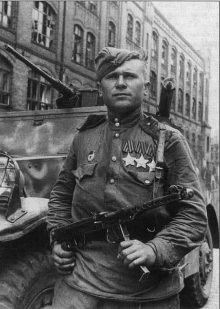 Полный кавалер Ордена Славы, гвардии сержант И.Д.Сериков на одной из улиц Берлина. Апрель 1945 года. За спиной сержанта бронетранспортер M3А1 с установленным на подвижном станке М22 по левому борту нештатным пулеметом «максим». Обращает на себя внимание и своеобразный камуфляж боевой машины