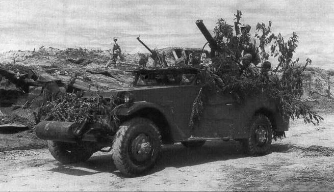 Истребитель танков М3 из состава 4-й роты тяжелого оружия морской пехоты США. Остров Сайпан, июнь 1944 года. С учетом специфики боя в джунглях эта машина буквально напичкана вооружением. Помимо штатной пушки на ней установлены два 12,7-мм "Браунинга", кроме того, на каждом борту имеется станок под пулемет 7,62-мм калибра и еще один такой станок смонтирован на щите орудия