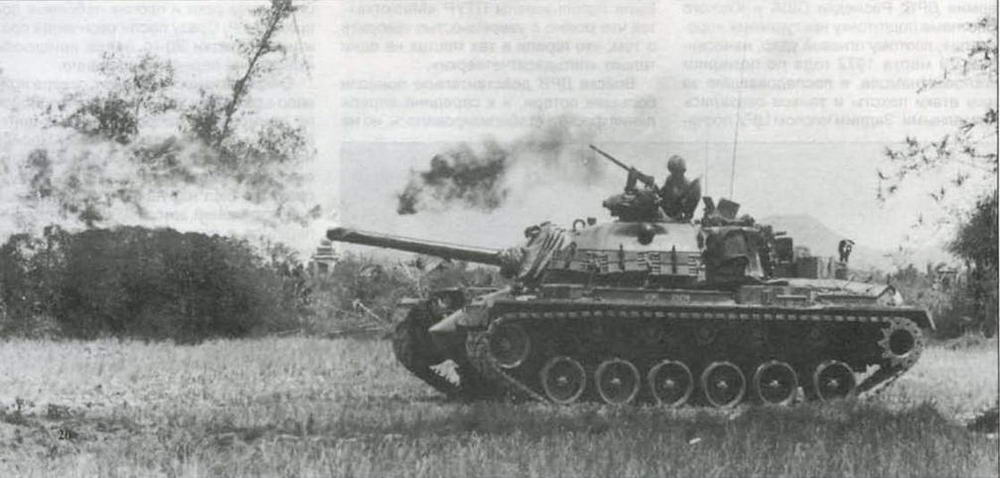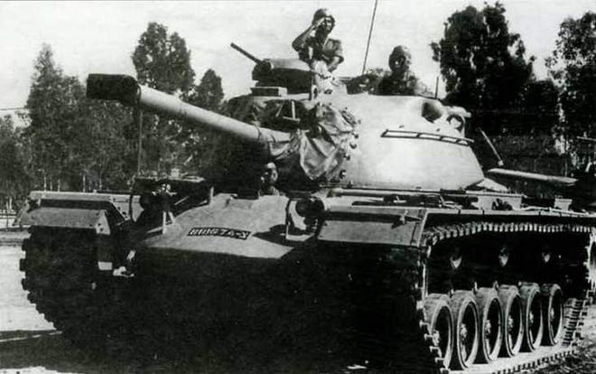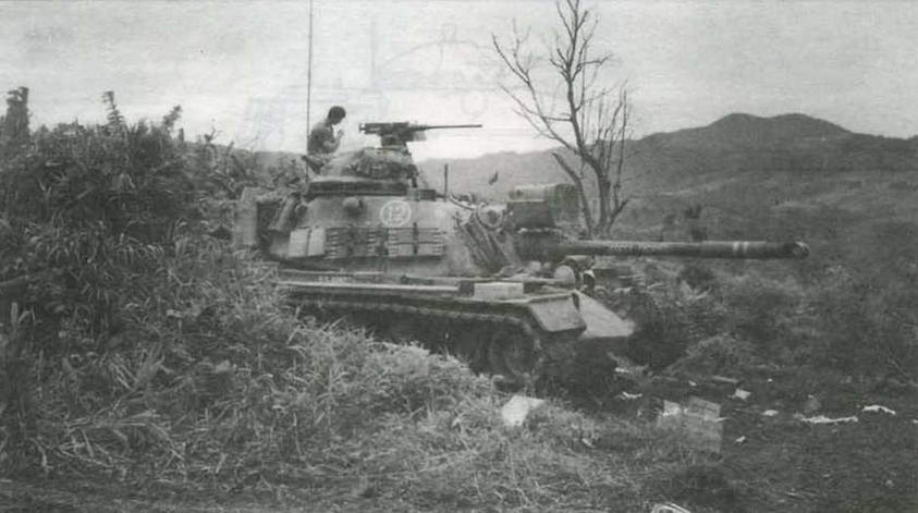 Танк М48А2С 5-й пехотной дивизии Армии США преодолевает препятствие. На стволе пушки установлен ксеноновый прожектор, неплохо зарекомендовавший себя во Вьетнаме