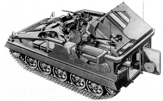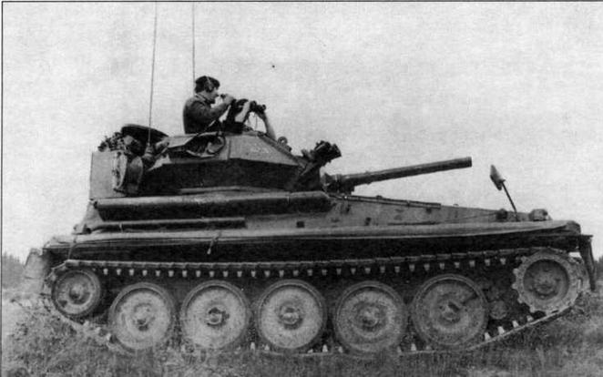 1 — карман воздухопритока к двигателю и трансмиссии; 2 — трансмиссионная перегородка; 3 — генератор; 4 — двигатель; 5 — воздушный фильтр; 6 — жалюзи окна воздуховывода; 7 — прибор наблюдения механика-водителя; 8 — спаренный пулемет; 9 — 76-мм пушка L23; 10 — противовес ночного прицела; 11 — дымовой гранатомет; 12 — ночной прицел; 13 — монтажное кольцо командирского прибора наблюдения; 14 — прибор наблюдения наводчика; 15—согласующее антенное устройство; 16— контрольный блок ТПУ; 17—ограждение пушки; 18 — крышка люка наводчика; 19 — радиостанция; 20 — крышка люка командира; 21 — антенна; 22 — ящики со снаряжением; 23 — направляющее колесо; 24 — сиденье командира; 25 — плафон внутреннего освещения; 26 — огнетушитель; 27 — панель приборов; 28—блок электропредохранителей; 29 — рычаг управления; 30 — ведущее колесо; 31 — педаль управления коробкой передач; 32 — панель генератора; 33 — моторная перегородка; 34 — радиатор; 35 — буксирная серьга