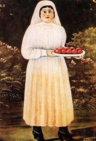 В изображении детей и взрослых тоже есть противопоставление большой - маленький. То же и когда художник пишет медведицу с медвежатами или свинью с поросятами. Жанровые сцены, прежде всего многочисленные "кутежи", показывают нам ежедневную среду, окружавшую художника. Накрытые столы, виночерпий, рога с вином, поднятые во время длинного традиционного тоста, а также шарманщики, ученый медведь на цепи - все это не условные персонажи, какими бывают гуляки, клоуны, циркачи в картинах профессиональных художников. Это мир духанов и садов, это люди, чьи имена иногда даже сохранились, которых художник по их просьбе запечатлел для памяти. Они красивы, их одежда живописна, позы и жесты выразительны. Стол, покрытый белой скатертью, - это их сцена, где разыгрывается пиршество, кутеж по всем его писаным и неписаным законам.