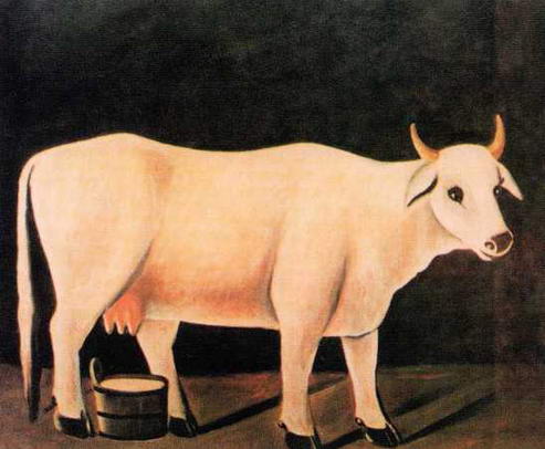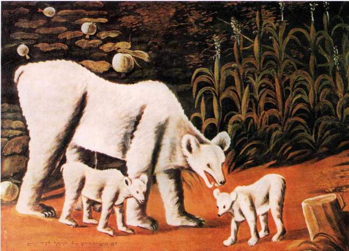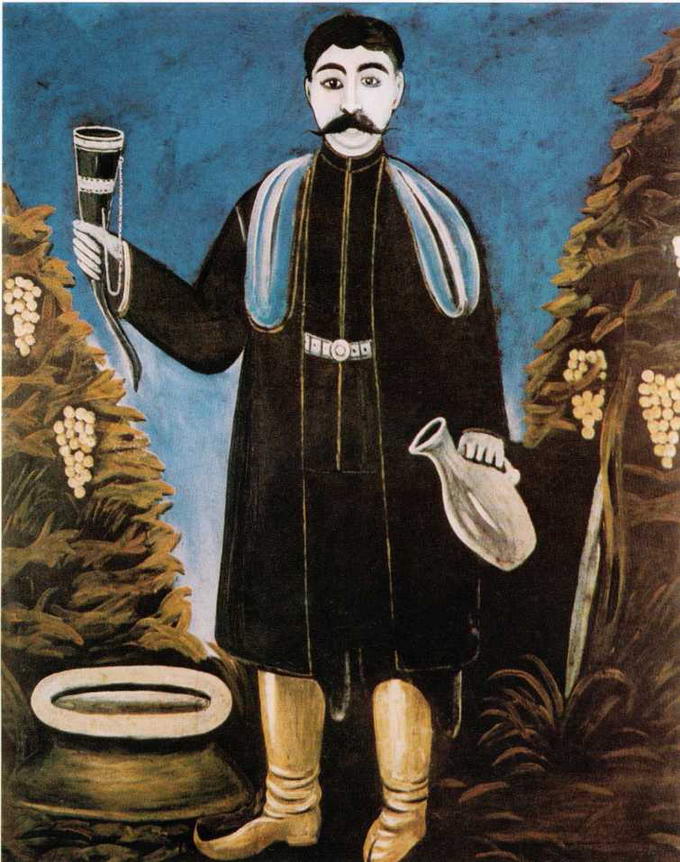 Помимо нашего сознательного восприятия,есть еще и неконтролируемые каналы связи с внешним миром. Их обнаружить помогает примитив. В мире ранней рекламы - живописных вывесок - он был особенно распространен. Но это лишь потому, что сила его воздействия была нужна владельцам лавок, которые пока иных способов завлечь покупателя не знали. Поэтому вывески, заборные надписи-графитти, рисунки сумасшедших и многие другие маргинальные области изобразительного - это не сам примитив, а среда, где его можно найти, откуда его не гонят. Сам же примитив, или наивное искусство, что в данном случае одно и то же, бьет, как родниковый ключ, из темных глубин бессознательного. Он всегда чужд моде, направлению, стилю. Его трудно найти в чистом виде, он замутнен примесями, относящимися к окружающей его культурной почве. Картины Нико Пиросманашвили были созданы в живописном грузинском городе Тифлисе в начале XX столетия. Они украшали стены духанов, то есть кабаков, где произносили длинные тосты, пили доброе кахетинское и ударявшее в голову молодое маджари, так что нет ничего дурного в том, что имя художника теперь видишь на этикетке бутылки. Говорят, сам Пиросмани был пьяницей и часто писал картины за плату натурой: вином и обедом. Был он человеком не от мира сего. Жил часто в том же ресторанчике, где и работал. А работал не только художником, но и просто маляром, если надо было, красил стены. В 1916 году тифлисские художники собрались, чтобы создать новую организацию, пригласили на собрание и самоучку Пиросмани. А он внес предложение: построить большой дом, чтобы художники могли собираться вместе и говорить об искусстве. Наверное, это было то, о чем он мечтал. А вскоре, в 1918 году, он умер, как нищий, как бродяга. После него не осталось дневников, не было у него имущества, наследников. Только сестра в родной деревне.