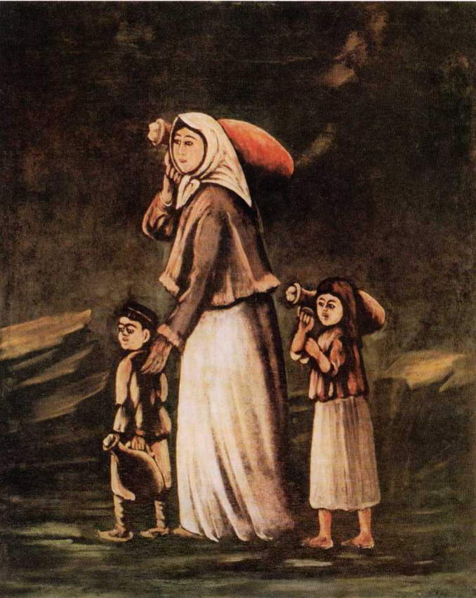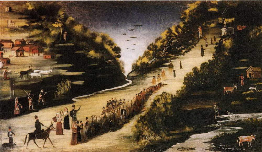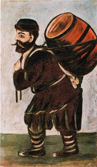 1899 год был голодным. Родственники уговорили Пиросманашвили торговать мукой. Был куплен фургон дорогой одесской белой муки. Напарник Алугишвили считал это глупостью - везти дорогую муку на продажу в бедную деревню. Что произошло в Мирзаани, опять покрыто мраком неизвестности. Пиросманашвили вернулся в Тифлис без денег. Он поссорился с родственниками: "Они меня выгнали: ты сумасшедший, зачем тебе деньги и жена!" Когда зять вновь приехал в лавку, Нико бросился на него с кинжалом. Убийства не произошло. Но теперь уже все вокруг понимали: с Нико невозможно иметь дело. Он был очень неуравновешенным, сердился внезапно из-за пустяка, мог внезапно осыпать человека проклятьями, накинуться на него с кулаками. Возможно, кавказский темперамент и представляется жителям России слишком горячим, и, безусловно, нравы тифлисского базара не были безупречны, и не один Нико решал там споры кулаками, но он воспринимался, говоря сегодняшним модным словом, как аутсайдер. По некоторым свидетельствам, он и сам чувствовал в себе что-то особенное. Но что? Автор наиболее подробного исследования о художнике, Кузнецов пишет: "Он крестил дочку Алугишвили, Марусю, и был шафером на свадьбе Нины, сестры его жены. Вскоре Нина умерла. Он не находил себе места от горя, он считал себя виновным и говорил каждому: "Я сглазил ее!" Потом заболела и умерла девочка, и он увидел в этом закономерность: "Я обеих погубил! Я приношу несчастье!""[1 Э. Кузнецов, указ, соч., с. 35.] Или другой случай: "Однажды он вбежал к жене Димитры с громким криком: "Помогите, помогите! Мой Святой Георгий, мой ангел хранитель стоит надо мной с кнутом и кричит: не бойся!" Это случалось не раз. "Мне явился архангел, у него в руке кнут - вот он здесь стоит!" Потом, успокоившись, объяснял: "Я верю в своего Святого Георгия. Когда я ложусь спать, он появляется с кнутом у моего изголовья и говорит: не бойся! А наутро моя кисть сама рисует""[2 Там же, с. 35-36.]. Стоп! Вот насчет того, что кисть сама рисует, мы слышали уже не раз. Обо этом говорят многие наивные художники. И о том, что картины привиделись во сне. И том, что нашептывал голос свыше. Французской наивной художнице Серафине Луи, по ее собственным словам, картины помогала писать Дева Мария. Конечно, можно описывать странности Пиросмани как глюки. Он пил в тот период особенно много. Мало ли что привиделось. Так и думали, наверное, жена Димитры и другие. Может, ангел с кнутом - это аллегория его чувства вины? А может быть, художник ощущал свою связь с иным миром? Почему он решил, что может сглазить ребенка? И женщину, на свадьбе которой присутствовал? Потому что знал, что свадьба и рождение ребенка - это не для него, и позавидовал, а потом думал, что своей завистью навел порчу? А почему на самом деле они обе умерли? Еще пару лет Нико с Димитрой держали лавку, а потом Нико сбежал. Поехал летом в Коджори, дачное место под Тифлисом, а вернулся оттуда только осенью. Наверно, партнеру было только лучше без него. Он стал выдавать Нико в день по рублю на жизнь. Вначале Нико целыми днями болтался на вокзале. Можно предположить, что были там с кондукторских времен старые приятели. Наверное, на вокзале перепадал и заработок. Он продолжал рисовать. Теперь своими рисунками он расплачивался с угощавшими его собутыльниками. Он брался за изготовление вывесок, расписывал стены. Так, наверное, и стал он странств