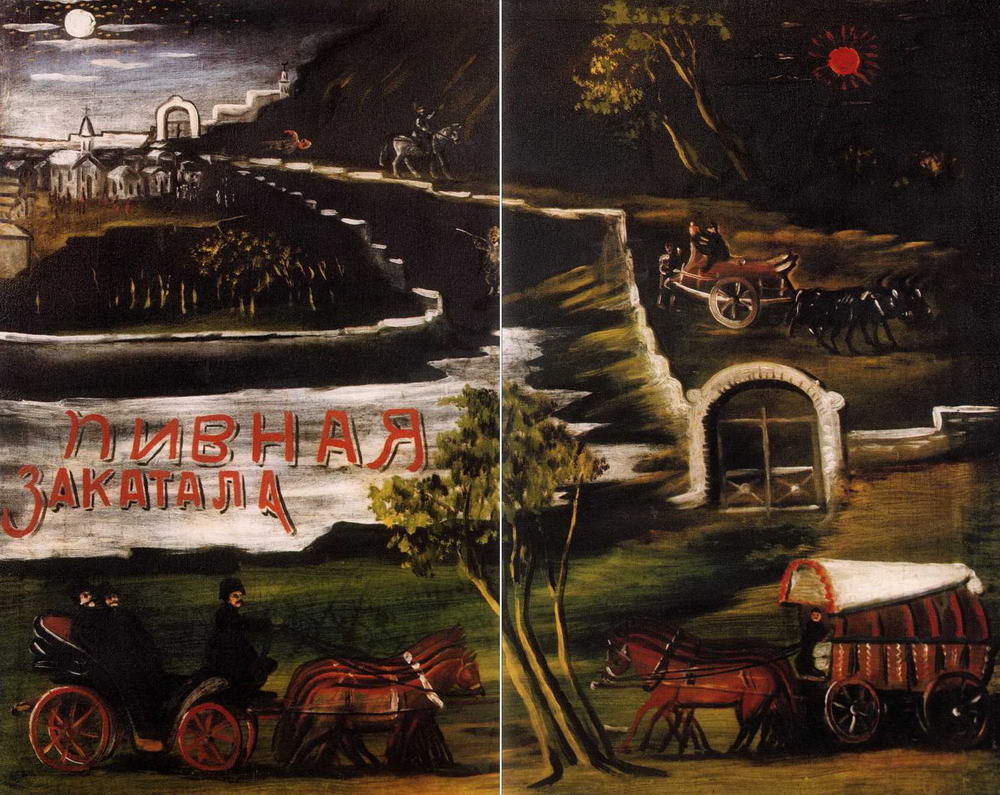 Пиросманашвили жил в собственном времени, не подчинявшемся стрелкам на городских часах. Вспомним, что он опаздывал на службу, когда был кондуктором, уходил из лавки, когда надо было торговать, не явился на встречу со Зданевичем, когда обещал. И искусство его плохо поддается хронологии. Слова Пастернака, обращенные к художнику: "Ты - вечности заложник, у времени в плену", в полной мере относятся к Пиросманашвили. Время его сковывало, угнетало. Время несло с собой перемены и движение, которые казались ему неинтересными. Он видел себя художником, который репрезентирует в вечности определенные предметы или понятия. Начнем рассматривать его произведения с вывесок. В вывеске, как и в рекламе, главное - постоянство. Это постоянство функции - всегда свежий, всегда горячий, всегда к вашим услугам, всегда в изобилии - и постоянство поставщика - хозяина, фирмы. Вот знаменитая вывеска пивной в Закаталах. Здесь есть надпись на русском языке "ПИВНАЯ ЗАКАТАЛА", а вокруг пейзаж с излюбленными Пиросмани сюжетами: люди, едущие в коляске. Буйволы, тянущие повозку с огромным бурдюком вина. Ворота в виде арки, горы, деревья, человек с ружьем, всадник. Справа на фоне гор изображено солнце, а слева на голубом небе - луна. Надпись наложена как бы на светлую гладь реки. Какое это время суток? Для живописной вывески вопрос звучит некорректно. В пивной вам будут рады хоть при луне, хоть при солнце. Пейзаж тоже не содержит рассказа о конкретных эпизодах. В пивную всегда приезжают кутить.