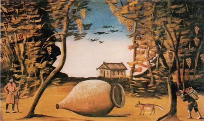 Еще одна работа - Марани в лесу. Она написана на жести и типологически близка к вывеске. Марани - огромный сосуд с вином - изображен в центре. Слева и справа две фигурки, сзади домик, вокруг деревья. Лес, собственно говоря, это рама для марани. Написанная на клеенке картина Свири. Из видов Имеретии соединяет элементы декоративного пейзажа и вывески. На первом плане изображены бочка и уже знакомые нам марани - целых два, в центре - стол с пирующими, справа - люди, ногами выжимающие сок из винограда. Сзади - зелень с виноградными гроздьями. В общем, картина на тему тяжелого труда грузинских виноделов. Натюрморт, написанный на жести, в сущности также является вывеской. Вверху по-грузински, а внизу по-русски можно прочесть надпись: "Да здравствует хлебосольный человек!". Собственно говоря, по-русски буквально написано: "Да здрастуите хеба солнаго человека". В слове "хеба" по старому правописанию вместо "е" написана буква "ять". Много ошибок и в других русских надписях на картинах Пиросмани. Вероятно, он совсем неплохо знал русский язык, но, когда писал на картине, старался выводить буквы, вписывая их в изображение, а об орфографии не думал. Известный русский наивный художник Павел Леонов, подписывая свои картины, тоже пропускал буквы и ошибался, хотя письма писал грамотно. На черном фоне в центре написан кувшин, слева и справа бутылки вина. Также изображены бурдюк, рог с вином, стаканы на подносе, два шашлыка на шампурах, рыбки на блюде, жареная курица. Пространственно все предметы скомпонованы так, чтобы занять всю плоскость вытянутого в длину прямоугольника. Натюрморт легко вообразить себе в качестве вывески или декоративного панно в шашлычной.