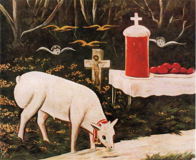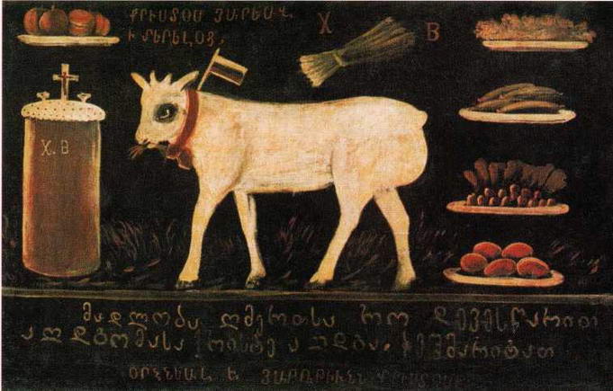 Пиросманашвили, как и другие создатели народных картинок, без конца варьировал и повторял одни и те же фигуры, сюжеты и фоны. Это повторение никогда не было точным, но удачно найденная деталь могла переходить из картины в картину иногда и без связи с основной темой. Среди его лучших сюжетов - Пасхальный барашек. Барашек - излюбленный мотив в украшении обиходных вещей - в виде барашков делались фарфоровые масленки, копилки. Одна из известных картин называется Барашек и пасхальный стол с летящими ангелами. Здесь на первом плане барашек пьет воду из ручья, сзади справа стоит стол с куличом и крашеными яйцами, левее - крест с распятием. На фоне темного леса с освещенными светлыми стволами деревьев можно разглядеть двух ангелов, нарисованных наподобие серафимов - только голова и крылышки, и просто птичек. Барашек - Агнец Божий, символ Спасителя и искупительной жертвы. Ночной пейзаж не случаен: о Воскресении объявляют в пасхальную ночь. Пасхальный ягненок в другой картине изображен так же с атрибутами Пасхи, куличом и яйцами. В отличие от первой описанной картины художник здесь пятнами белого цвета, легко находящими одно на другое, передает пушистую фактуру шкурки ягненка. Тоже белым цветом, но по-другому работая кистью, Пиросмани изображает шерсть в картине Медведица со своими медвежатами (1917). Барашек открывает вереницу анималистических образов у Пиросмани. Они появились не под влиянием посещения зверинцев, как полагал будущий писатель Паустовский. Эти звери - своеобразные портреты. В них чересчур много человеческого. Ладо Гудиашвили утверждал, что у животных на картинах Пиросмани глаза самого художника. Леонидзе в поэме, посвященной Пиросмани, обращался к нему: "Как ты жирафьим глазом / Передать умудрился тоску, / Что в глазах своих носишь сам?" (перевод Л. Пеньковского). Знаменитый Жираф писался во время пребывания художника в саду "Эльдорадо". Безумный взгляд этого диковинного зверя не зря интриговал зрителей и вдохновлял поэтов. Пиросманашвили изумительно рисовал краской прямо на холсте. Глаза жирафа написаны немногими движениями кисти, а их описание способно вылиться в целый поток слов и ассоциаций, нимало не приближающий нас к зрительному контакту с картиной.