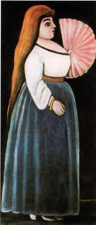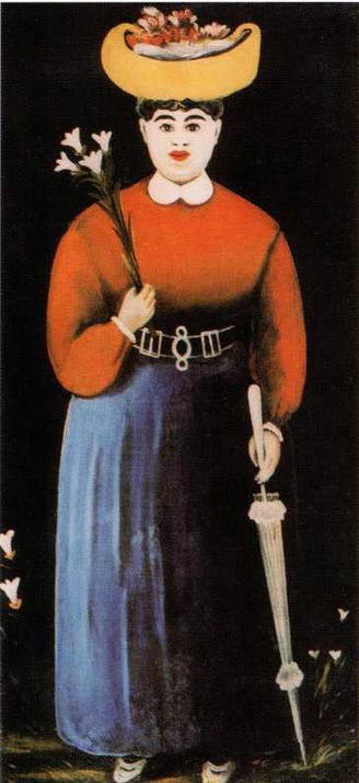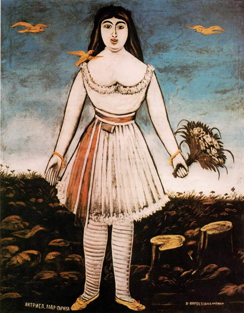 Знаменитая Актриса Маргарита (1909 ?) представляет собой как будто примитивную копию с театральной афиши. Фигура у нее неуклюже окаменевшая, лицо застыло. Она одета в белое короткое платье с большим декольте. В руке букет, на фоне внизу, как всегда, пеньки, позади голубое небо. В пустоте неба - птички, одна из них едва задевает обнаженное плечо красавицы. Что поражает в этом иератическом образе? Чем он так волнует зрителя? Художник чаще рисовал мужчин, чем женщин, ведь мужчины играли главную роль в жизни. Женщинам положено было находиться на своей половине дома. По улицам свободно и не торопясь разгуливали без сопровождения мужчин лишь жрицы уличной любви, которых было немало в Ортачальских садах. По свидетельству Зданевича, Пиросманашвили говорил ему: "Когда я пишу погибших ортачальских красавиц, я их помещаю на черном фоне черной жизни, но у них есть любовь к жизни - это цветы, помещенные вокруг их фигур, и птички у плеча. Я пишу их в белых простынях, я их жалею, белым цветом я прощаю их грех"[1 К. Зданевич, указ, соч., с. 46.]. Почему-то кажется, что эти разъяснения Пиросманашвили придумал, разглядывая свои собственные уже написанные картины. Вряд ли черное и белое он заранее предназначал для изображения порока и добра. Нет, он видел внутренним взором противостояние этих двух цветов, он переносил его в свои картины и затем "считывал" с них информацию в морализаторском ключе. Магия черного и белого, которой он владел, значила куда больше, нежели аллегорическое противопоставление. Черные глаза и черные брови Маргариты на ее белом лице поражают своей иллюзорной живостью, натуральностью. Эта странная фигура с прямыми руками и негнущимися ногами в полосатых чулках - не кукла, она живая! Она живет в мире грез и воображения. Велика доля воздействия этого портрета в сложении легенды о любви Пиросмани, которую мы приведем в пересказе Паустовского: "Маргарита редко соглашалась поужинать с посетителями, но равнодушно, как должное, принимала от них маленькие подарки. Потом она их раздаривала подругам. Она была совершенно одинока.