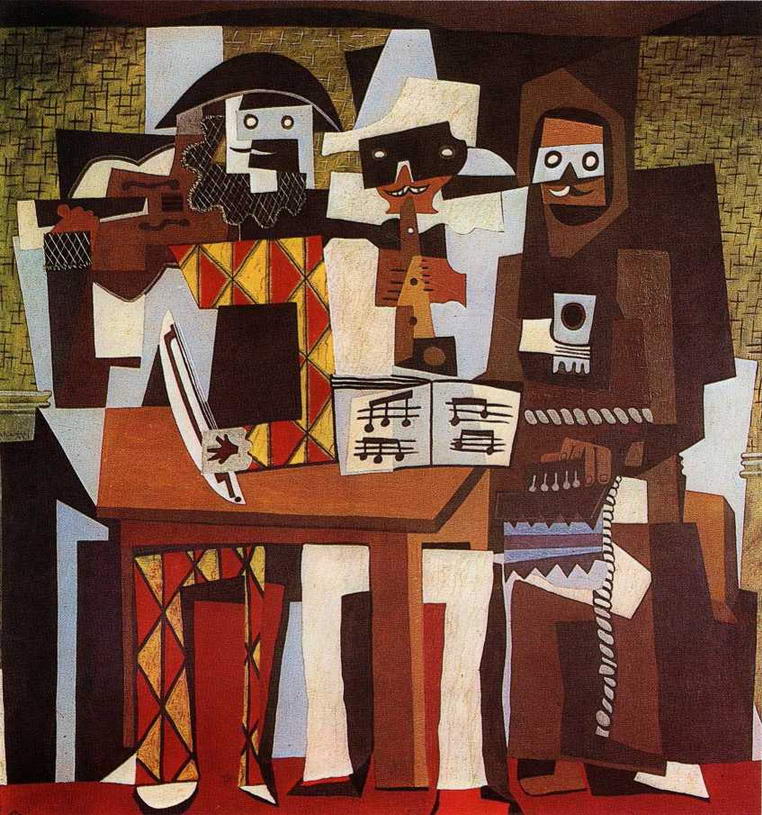 Живопись в жанре кубизма отличается здесь вниманием к передаче объема, которая в этом случае была принесена в жертву разнообразию цвета. После войны Пикассо, все еще обращаясь в своих картинах к декомпозиции, переворачивает границы, как видно на картине „Три музыканта“ (1921, Филадельфия, Художественный музей): фигуры, кажется, пытаются стать плоскими, двухмерными, тогда как цвета обладают живостью, до сих пор невиданной в его работах. Желая возвыситься во всех областях искусства, Пикассо не ограничивается только живописью.