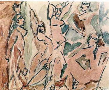 Одно из важнейших произведений не только Пикассо, но и всего искусства нашего столетия, эта картина представляет собой кульминацию работы художника над объемной передачей формы, проделанной в серии эскизов 1906 года, посвященных тематике "негритянской" скульптуры, а также скульптуры испанского средневековья. Здесь все еще чувствуется и влияние картин Сезанна. Результаты этой работы легко прослеживаются в лицах изображенных справа фигур, а также в умелой передаче плотного, насыщенного пространства. Картина, которую Пикассо оставил незаконченной, может также считаться первым шагом к деформации, присущей будущему кубизму, особенно это относится к фигуре женщины на корточках, помещенной справа. Рисунок вызвал неоднозначный резонанс среди парижских художников: его влиянию Жорж Брак обязан появлением своего "Grand пи". Его отдаленное воздействие можно увидеть и во многих других произведениях, таких, как "Три Грации", вписанные Робером Делоне в картину "Город Париж".Уличные девки или городские женщины?
