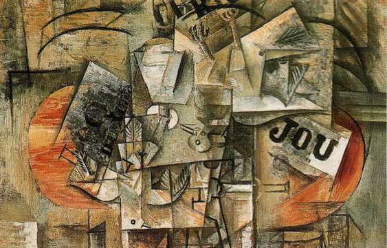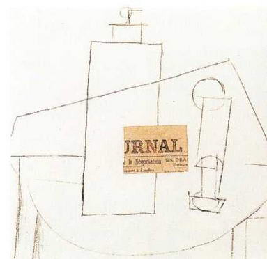 Беспощадность кубистических деформаций в начале периода кубизма резко обособила произведения Пикассо и Брака. Они чувствовали потребность перенести на холст детали, которые позволят угадывать сюжеты. Они вставляли в картины фрагменты рисунков в реалистической манере и проштампованные письма. Художественный язык не повторял реальность, а ссылался на нее, используя особый инструментарий, но будучи совершенно автономным. Наиболее выдающейся частью этого процесса стало изобретение коллажа. Желая изобразить стул, Пикассо приклеивает на холст кусочек вощанки с отпечатком соломенного плетения стула и окружает картину по периметру веревкой. Это обманчивое изображение на самом деле усиливает отнюдь не обманчивое впечатление от рисунка, утверждая обособленность современного художественного выражения. Это важнейшее произведение, предваряющее многие поэтические творения будущего, от ready-made до поп-искусства. И Пикассо, прекрасно осознавая это, не желал с ним расставаться.Портрет газеты