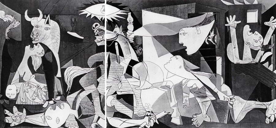 26 апреля 1937 года, во время гражданской войны в Испании, \J нацистская авиация, поддерживавшая войска Франко (будущий диктатор, выступивший во главе фашистского путча), впервые разрушила испанский город, до основания разбомбив Гернику в Баскской области. Находясь под впечатлением, Пикассо в том же году пишет картину, посвященную этому событию, заказанную ему правительством Испанской республики. Огромное полотно (см. стр. 56) становится символом протеста против насилия. Это произведение расценивается как поворотный этап в творчестве Пикассо. В это время художник подводит итоги своей предыдущей работы и открывает для себя новые перспективы на будущее.
