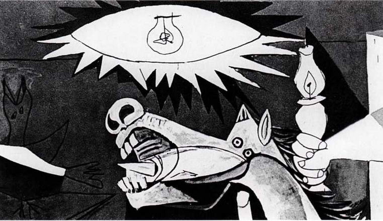 Кроме того, в "Гернике" можно встретить намеки на многие произведения монументальной живописи, относящиеся к эпохе между Темными веками и Возрождением. Похоже, что Пикассо хочет утвердить право собственной живописи на свободное обращение с классикой. И если сам рисунок, наполненный также и цитатами из более ранних произведений самого Пикассо, оживлен этим стремлением высветить и ввести в историю собственно фигуру художника, то решение ограничить цветовую гамму черно-белыми тонами, очевидно, принято с целью напомнить зрителю моментальность фоторепортажей. Пикассо хочет воплотить в "Гернике" образ художника двадцатого века, как в плане его живописи (сочетающей авангардизм и память о традиции), так и в моральном плане (человек, живущий между мифом и реальностью). Картина уже в 1937 году затрагивает вопрос, ставший основным для дискуссий в художественной среде послевоенных лет, - вопрос о том, сможет ли мораль избрать своим рупором авангардизм. Те же проблемы поднимает серия из восемнадцати гравюр, написанных до и после работы над "Герникой" и предназначенных художником на продажу для финансирования испанского антифашистского движения. "Сны и обманы Франко" I и II сопровождаются факсимиле с несколькими стихотворениями Пикассо (он начал писать стихи в 1935 году).