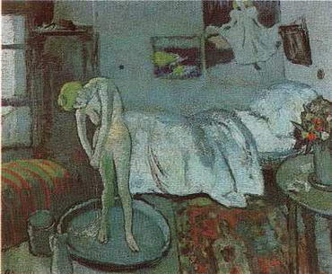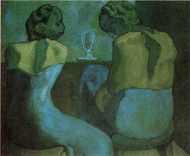 Первую свою зрелую манеру Пикассо обретает в так называемый «голубой период». Преодолев всякое влияние постимпрессионизма, форма на его картинах становится плотной, реальной, как на картинах «Две женщины в баре» (внизу, 1902, Барселона, Музей Пикассо) и «Голубая комната» (вверху, 1901, Вашингтон, коллекция Филипс). Для этого периода характерно сужение палитры до нескольких глубоко одухотворенных основных тонов.