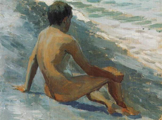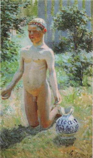 Правда, художник попробовал поступить в мастерскую Пюви де Шаванна, что иронично описал в письме к матери: «Я все время боялся, что к моему приезду он возьмет да помрет, ведь ему уже за семьдесят. Но он сделал хуже - женился и перед свадьбой закрыл свое ателье. По приезде сюда я разыскал квартиру этого новобрачного и явился к нему в девять утра. Я застал его в бледно-сиреневом халате и высказал ему свое желание. И он хотя и проникся чувством уважения к моему стремлению, но все-таки заявил, что уже больше учеников не имеет»[1 Цит. по: А.А. Русакова. Борисов-Мусатов, с. 40.]. Это произошло на второй год пребывания Борисова-Мусатова в Париже, после летних каникул, проведенных в Саратове. Узнав, что русский молодой художник учится у Кормона, Пюви де Шаванн посоветовал ему продолжать занятия в той же мастерской. Что касается живописи, то в ней Борисов-Мусатов поначалу хотел освоить в полной мере принципы импрессионизма. Его заботила проблема изображения обнаженного тела в пленэре. В Саратове он в 1896-1898 годах создал целую серию обнаженных мальчиков-натурщиков на фоне зелени. В них художник увлечен передачей рефлексов на теле, их изменчивости в солнечный день. Любопытно, что первый этюд такого рода - Мальчик с собакой - был написан Борисовым-Мусатовым еще, видимо, до поездки в Париж в 1895 году, а завершил эту серию Мальчик около разбитого кувшина. По цветовому решению, по упоению солнцем, по характеру мазка, близкому к мазку французских импрессионистов, эта работа ничем не отличается от серии тех этюдов, которые Борисов-Мусатов писал в Саратове, во время летних отлучек из Парижа. Кстати, тогда же был написан и этюд Дерево (1896-1898), который по уровню мастерства обоснованно сопоставлялся с Сиренью на солнце Моне[1 О.Я. Кочик. Живописная система В.Э. Борисова-Мусатова. М., 1980, с. 54.].