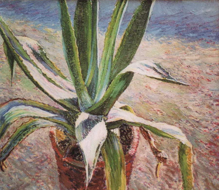 Создававшиеся как этюды для изучения взаимодействия натуры с солнечным светом, «мальчики» Борисова-Мусатова вместе с тем были наполнены образно. Не случайно рядом с ними вспоминаются этюды Александра Иванова. Учитывая поэтическую природу дарования Борисова-Мусатова, его стремление к возвышенному идеалу, нельзя не согласиться с утверждением, что «ранние мусатовские “мальчики” кажутся некоторой вариацией эстетического воплощения того же гармонического идеала человеческого бытия, что и Пейзажи с мальчиками Александра Иванова»[2 М.Г. Неклюдова. Традиции и новаторство в русском искусстве конца XIX - начала XX века. М„ 1991, с. 232.]. Во время летних пребываний в Саратове в 1896-1898 годах, когда прерывалась работа над рисунком в мастерской Кормона, Борисова-Мусатова буквально преследовала мысль о создании масштабной картины. Элементы картинности появились уже в портрете сестры Елены Эльпидифоровны Мусатовой (1896), которая часто позировала художнику. В этюде Девушка с агавой (1897) в классической системе импрессионизма написан фон переплетающимися узкими полосками зеленого и желтого цвета, а горшок с агавой и профиль Елены Мусатовой отмечены четкостью контура и пластической вещественностью. Правда, этюды к картине, в целом не выходящие за пределы импрессионистической системы, все же показывают некоторые попытки выйти за пределы ее. Лучший из них, безусловно, Агава (1897). Написав цветок густой красочной массой, пластично, Борисов-Мусатов выдвинул его резко вперед, срезав листья краями холста. В композиции, где предмет несколько опрокинут на зрителя, можно усмотреть и влияние Сезанна (его тоже во Франции видел русский художник). Но за цветком открывается бездонный мир, заставляющий вспомнить решение пространства в Ветке Александра Иванова. Отдельный предмет - агава - словно становится частью макрокосма. Здесь предвосхищены и последующие искания Петрова-Водкина с его идеей сферической перспективы. И это неудивительно, ведь уроженец Саратовской губернии Петров-Водкин очень высоко ценил искусство своего, в какой-то степени, земляка.