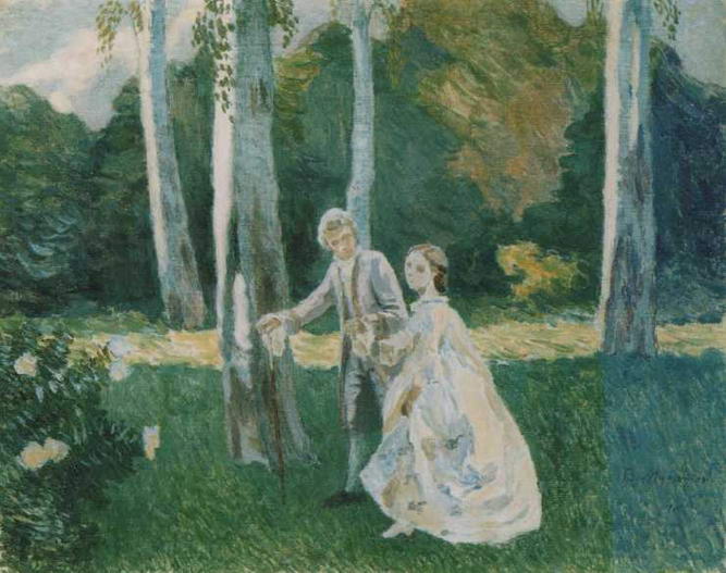 Несмотря на критическое отношение Борисова-Мусатова к Автопортрету с сестрой именно эта картина наметила дальнейший путь художника. «Мелодия грусти старинной»[1 Цит. по: А.А. Русакова. Символизм в русской живописи, с. 201.], как выражался сам художник, прозвучала впервые именно здесь, а затем возник Осенний мотив (1899). В беседке, обвитой осенними листьями, перед девушкой с лицом сестры художника склонился кавалер в напудренном парике и светлом сине-сиреневом кафтане. Характерно, что Борисов-Мусатов не стремился точно воспроизвести прошедшую эпоху, недаром для картины он заказал портнихе женское платье 1830-1840-х годов и костюм кавалера XVIII века. Именно такое вольное отношение к минувшему долгое время не принимали художники объединения «Мир искусства». В этой картине художник опосредованно выразил чувства, порожденные неразделенной влюбленностью в помещицу Анну Воротынскую. Грусть порождают и неяркие лучи осеннего солнца, пробивающиеся сквозь желто-оранжево-красную листву. Цвет еще дробится рефлексами, объединяющими мужскую и женскую фигуры, но светлое платье девушки и сине-сиреневый кафтан мужчины даны как большие цветовые зоны. Стиль модерн, таким образом, присутствует здесь, своеобразно сочетаясь с импрессионистическими чертами, что, впрочем, достаточно часто присутствует в явлениях русского искусства. Плавные округлые линии, объединяющие фигуры[1 О.Я. Кочик. Указ, соч., с. 124-125.], вместе с нежным колоритом создают ту музыкальность, которая выдает в мастере представителя стиля модерн, - ведь романтическое положение о главенстве музыки среди искусств всячески подчеркивалось адептами этого стиля. «Приближаясь к музыке, художественное произведение становится и глубже, и шире», - считал Андрей Белый[2 Андрей Белый. Формы искусства. - Андрей Белый. Символизм как миропонимание. М., 1994, с. 100.]. Видимо, это его привлекало к картинам Борисова-Мусатова, под влиянием которого возникли некоторые стихотворения из сборника Золото в лазури. А строки: Любезная сердцу картина! Вся в белых, сквозных кружевах, Мечтает под звук клавесина... Горит в золотистых лучах И хмелью обвитый карниз, И стены. Прекрасный и юный, Пред нею склонился маркиз В привычно заученной роли, В волнисто-седом парике, В лазурно-атласном камзоле, С малиновой розой в руке [1 Андрей Белый. Собрание сочинений. Стихотворения и поэмы. М., 1994, с. 45.] - прямо-таки навеяны Осенним мотивом.